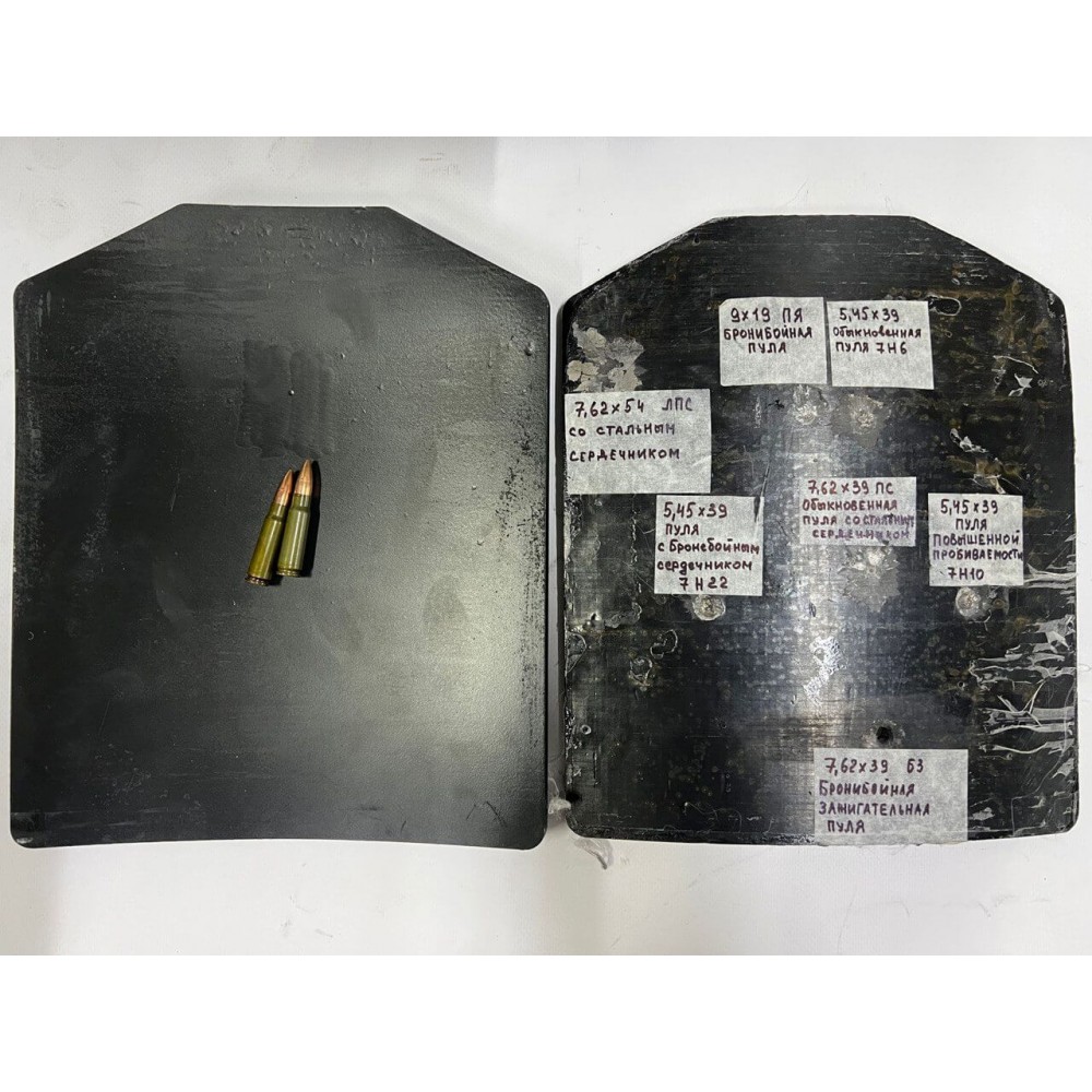 Комплект из 2-х пластин, обеспечивает защиту при обстреле из автомата АК 74, 5,45 мм, патронами с пулей ПП, инд. 7Н10; АКМ 7,62 мм, патронами с пулей Пс, инд. 57-Н-231.